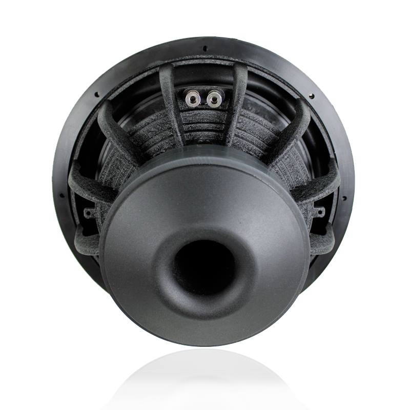 “BP” option which was a machined aluminum compression plug to the pole which helps channel all of the air under the dustcap around the coil for better cooling. To aid with this increased airflow we also added 6 axial cooling channels in the top plate. Along with increased thermal capacity comes the addition of an extra spider and a changed spider pack. All of these features increase power handling from 200-500 Watts depending on the application.