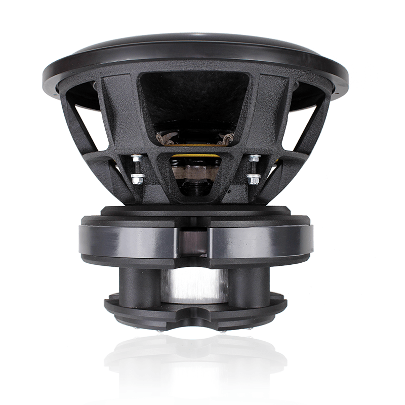 “BP” option which was a machined aluminum compression plug to the pole which helps channel all of the air under the dustcap around the coil for better cooling. To aid with this increased airflow we also added 6 axial cooling channels in the top plate. Along with increased thermal capacity comes the addition of an extra spider and a changed spider pack. All of these features increase power handling from 200-500 Watts depending on the application.