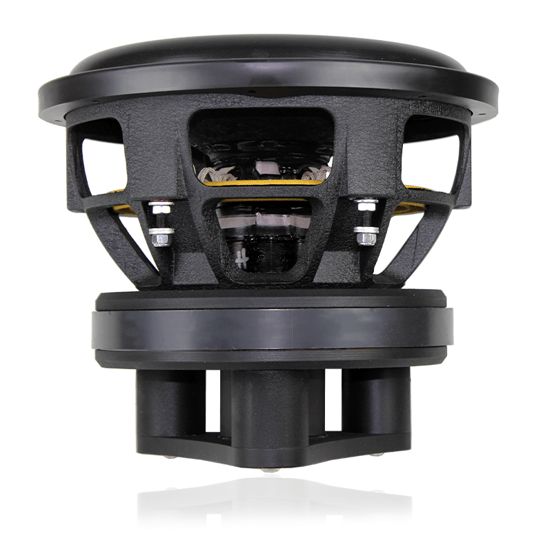 “BP” option which was a machined aluminum compression plug to the pole which helps channel all of the air under the dustcap around the coil for better cooling. To aid with this increased airflow we also added 6 axial cooling channels in the top plate. Along with increased thermal capacity comes the addition of an extra spider and a changed spider pack. All of these features increase power handling from 200-500 Watts depending on the application.
