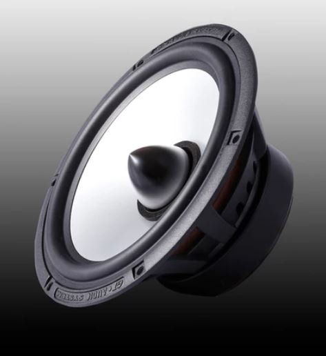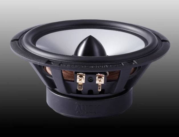 Midwoofer geventileerd met gegoten aluminium korf en synthetisch metalen conus met rubberen surround.